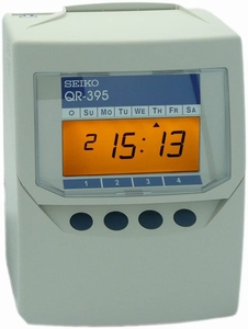 Registrador horario para el control de Entrada/Salida del personal, en fichas de cartulina, con cálculo automático de tiempos entre fichajes y total acumulado, y con visor LCD de gran tamaño retroiluminado.